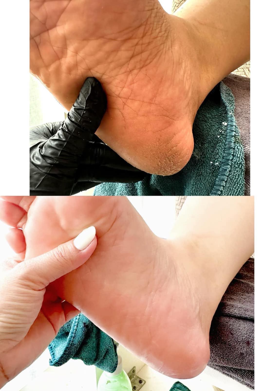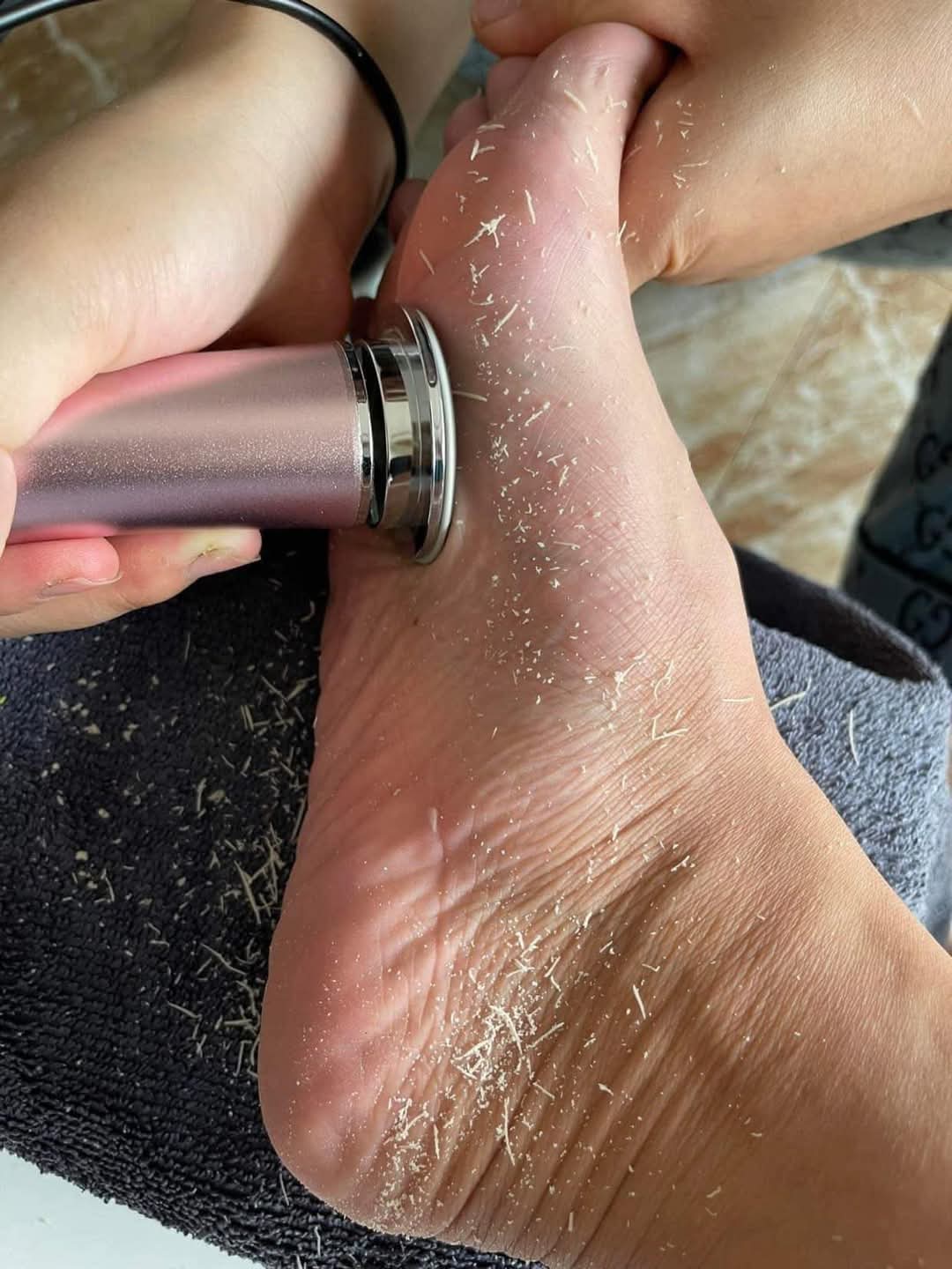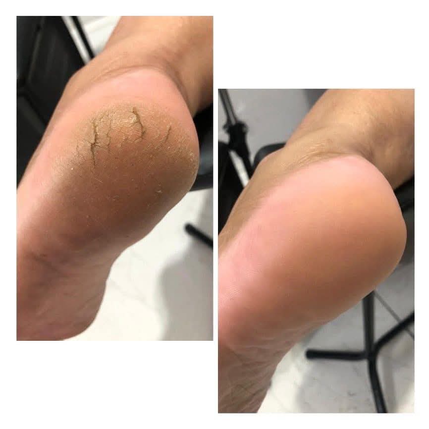 Gồm các bước như _ngâm chân thư giãn _ủ chân _chà gót bằng cây inox _chà mịn bằng máy _tẩy tế bào bào chết _thoa kem dưỡng _Massage