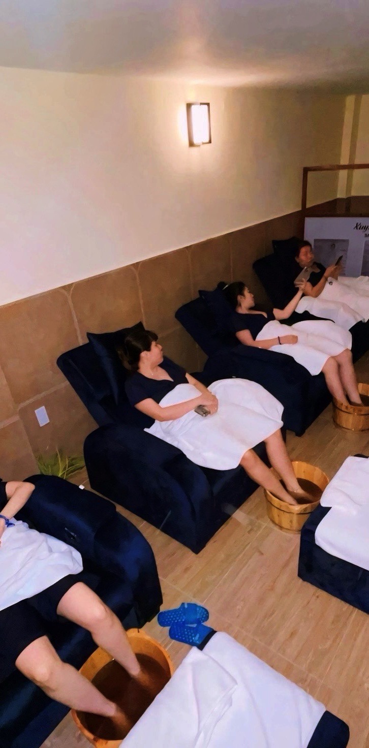 bao gồm xông hơi ướt và xông hơi khô.chỉ tính thời gian bắt đầu massage.qúy khách làm massage chân 90'.massage chân có ngâm chân bằng thảo dược.trong quá trình massage bao gồm bấm huyệt,vuốt dầu, giãn cơ.giúp máu lưu thông giảm đau nhức,giảm stress.
